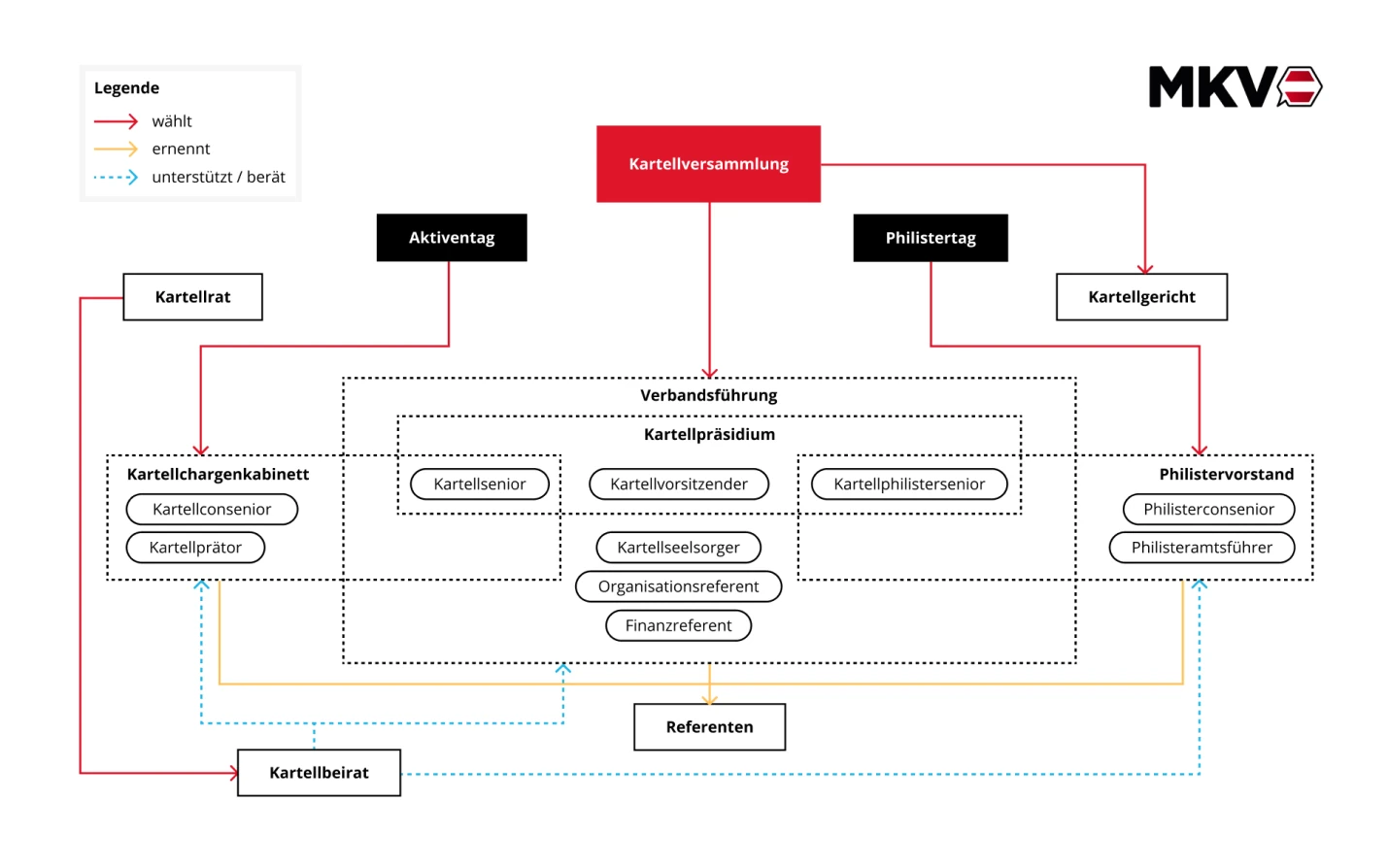Klare Zuständigkeiten, demokratische Entscheidungsprozesse und transparente Abläufe bilden die Grundlage seines Handelns. Die Struktur des MKV sorgt dafür, dass Verantwortung auf mehreren Ebenen getragen wird: in den einzelnen Verbindungen vor Ort ebenso wie im Verband auf Landes- und Bundesebene. So werden Austausch, Mitgestaltung und Kontinuität gleichermaßen ermöglicht.